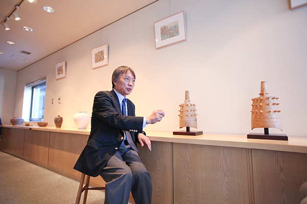 | 浦上 | もちろん。ここ日本橋は明治、大正くらいから 日本の骨董屋さんというか、古美術商のメッカですから。 僕は繭山龍泉堂という老舗で 5年間修行したのちに独立したんですが、 当時このお店が入っているビルは建ってなくて、 ここのすぐそばで6年くらい営業していました。 その後このビルに移転したんです。 本当は1階が良かったんだけど、結果として3階になりました。 でもこれくらいのスペースだと3階の方が落ち着くんですよ。 |