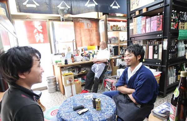 | 高橋 | 今、ああやって親父とお客さんが お酒を選んでいるじゃないですか(接客している様子を見ながら)。 あんな感じで、主がお客さんに「じゃあ次はこれどう?これは?」 って勧めるのを当たり前のように見てきました。 うちにくるお客さんはお酒を買うのはもちろんなんですが、 親父に会いに来ている人がすごく多いんです。 1本200円くらいのワンカップを買って 親父と長く話しているのを見たりして… なので、僕の商売の仕方は父の影響がすごく強いです。 親父は損得より、人との縁という人なので。 |